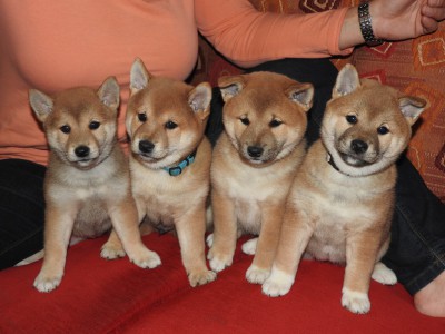 Přidělili jsme jména. Pejsek se jmenuje CHIVAS - (pacičky bez ponožek, modrý obojek), na shibího pejska je moc hodný, s vyrovnanou povahou. Fenečka č.1 je CHATNI - (má obě ponožky na předních packách stejně vysoké, stříbrný obojek), je to takový kašpárek, často si při hraní vystačí sama a roztomile při tom zvedá přední nožičky. Fenčka č.2 je CHILLI - (na předních packách různě vysoké ponožky, oranžový obojek), je neúnavná, nejživější ze štěňat, a nejsilnější. Fenečka č.3 je CHERRY - (nejmenší, bez ponožek, růžový obojek) od narození díky své velikosti pohybově nejšikovnější, jemná, a větším sourozencům se umí postavit.